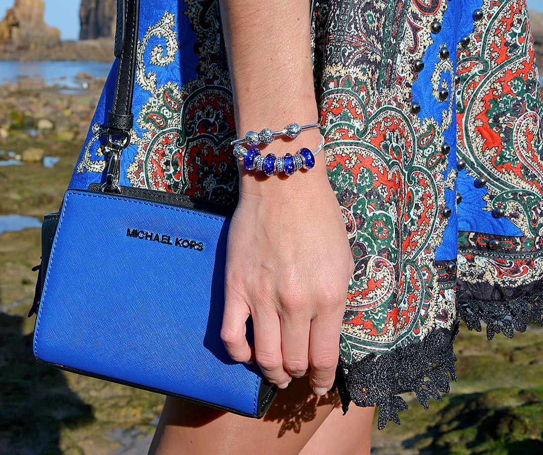En esta ocasión, también juegan un papel muy importante las joyas y bolso que llevo. Pulseras de Pandora con abalorios en tonos azules y pulseras de Swarovski de malla y cristales en varios colores. Todo de Joyería Modesto (982 131 996).