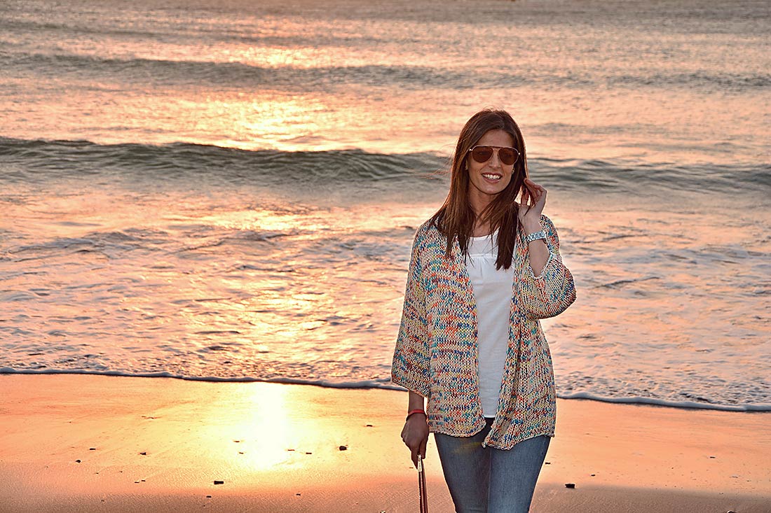 La otra opción, en vez de ser con jersey es con chaqueta de punto multicolor en los mismos tonos y gafas de sol aviator cobrizo de Michael Kors, también de Opticalia Global Ribadeo.